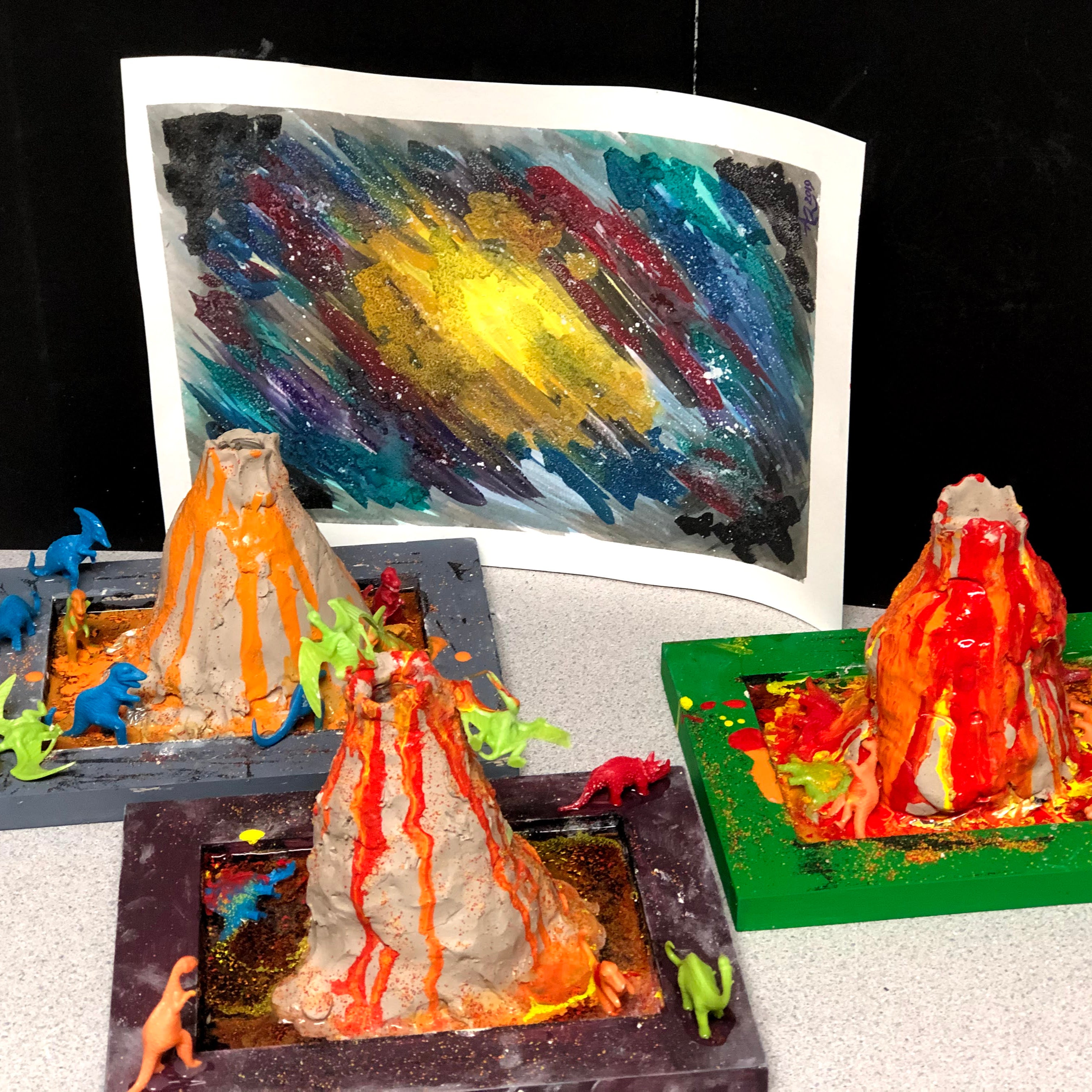We make slime, do paint pouring, and make interesting reactive art including making a mini erupting volcano!
