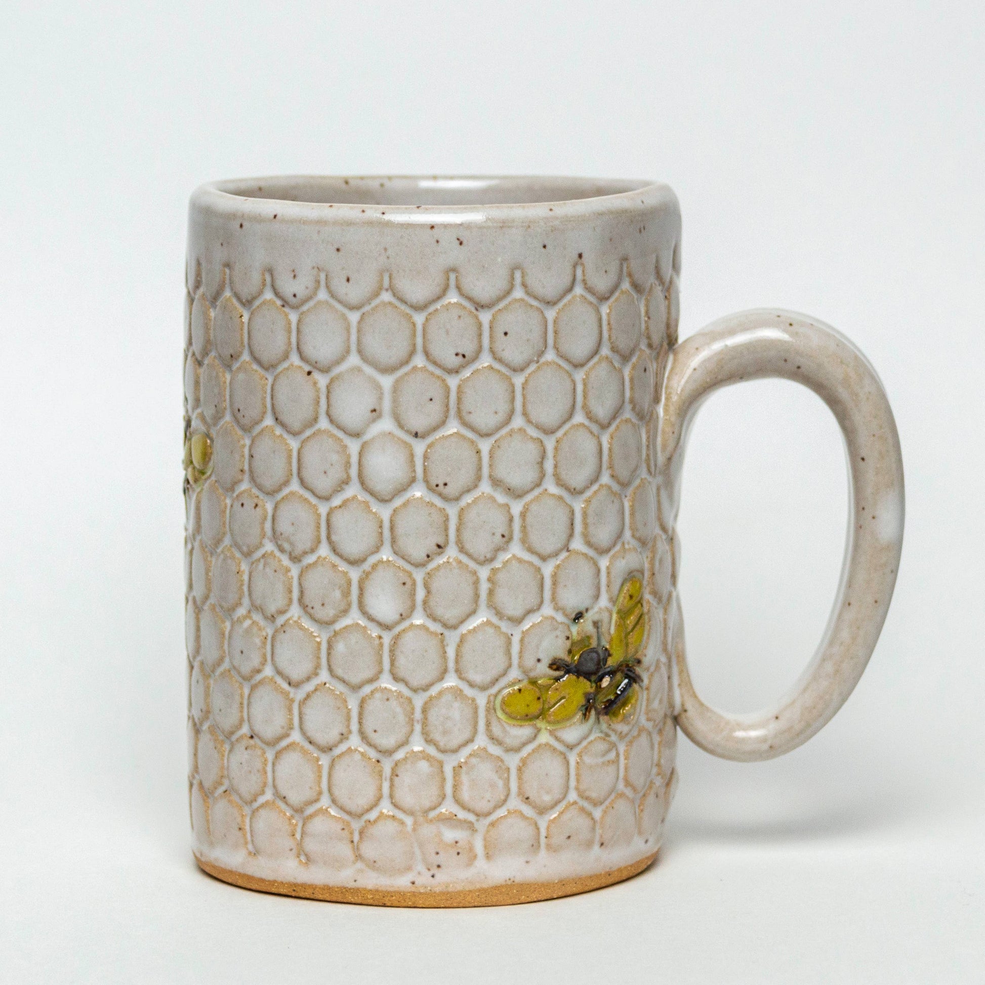 This beautiful stoneware ceramic bee pattern mug, approximately 16 oz. is hand-built and hand-glazed. Food, dishwasher, and microwave safe. It measures approximately 3 1/4 inches wide and 4 3/4 inches high. All our ceramic items are handmade and will vary from one to the next. No 2 pieces will be exactly the same. Colors may vary slightly.