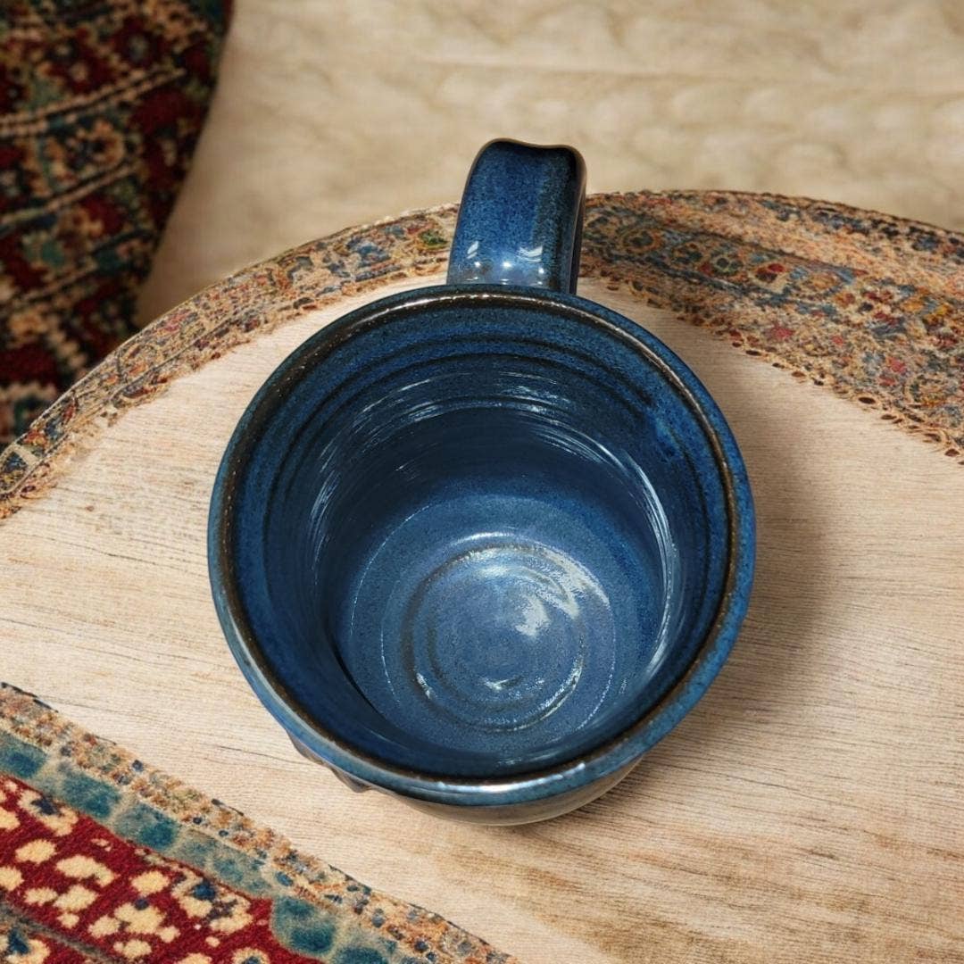 Each mug is hand-thrown and hand-painted. This mug was hand-dipped in our lead free Floating Blue mug, and it holds approx. 14 fluid ounces. Please allow for slight variations in color, shape, and size, as the mug was made by hand.