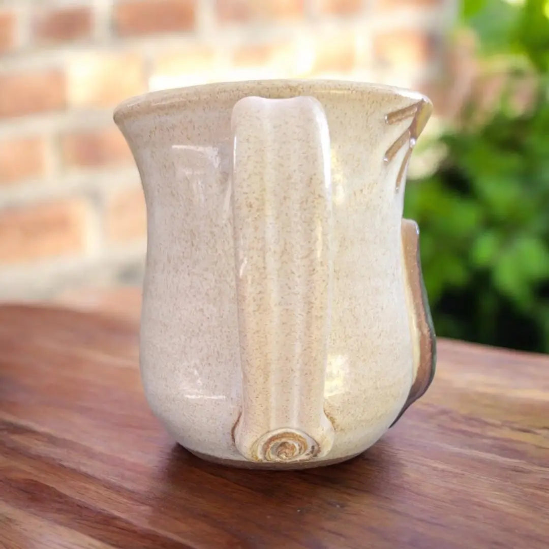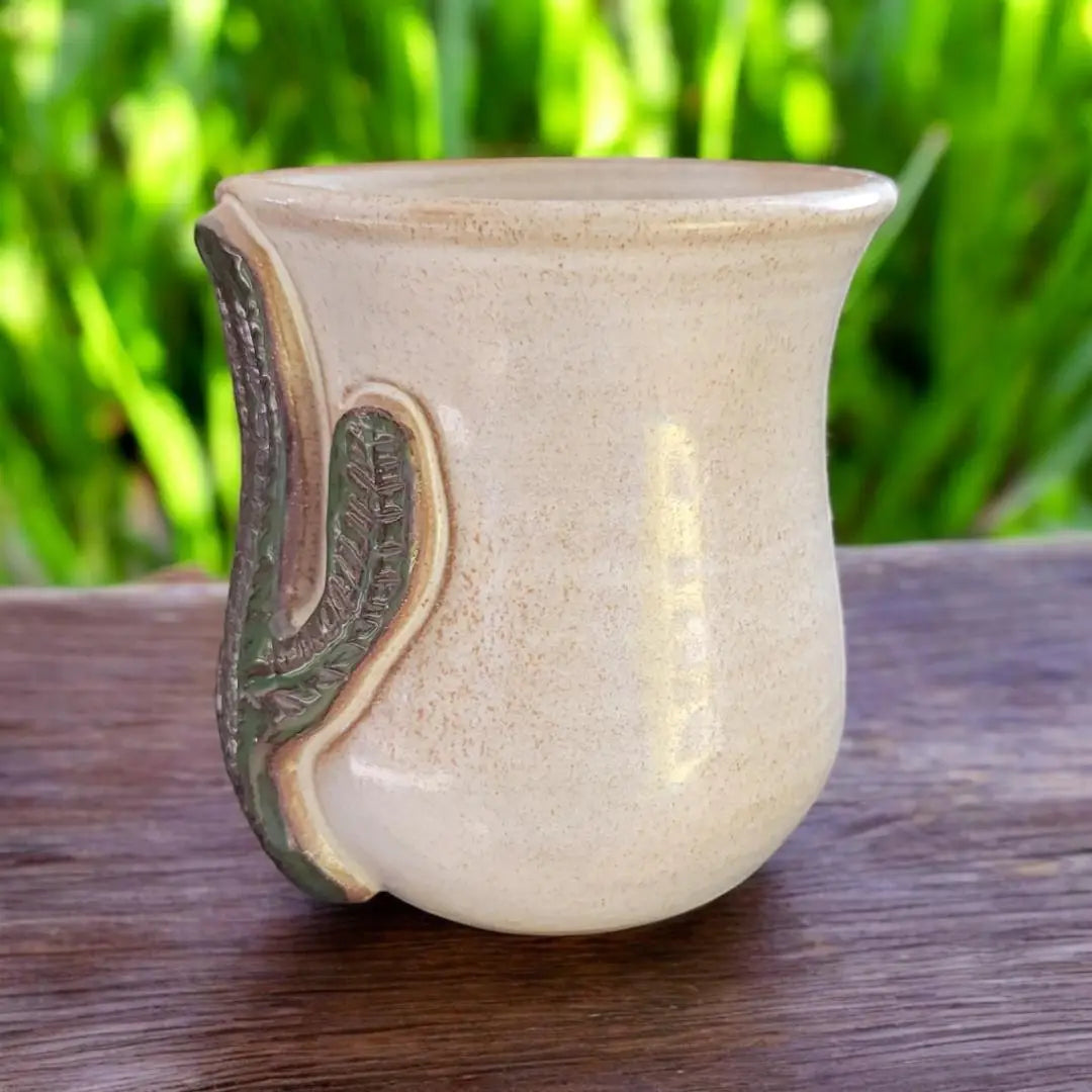 Enjoy a little bit of the southwest no matter where you might be living. When it's hot as a desert, this fun, bright cactus and carved yellow sun make for a perfect mug to help you cool off with a drink! Each mug at MudWorks is hand-thrown and hand-painted. This piece was hand-dipped in our own lead free Sandstone glaze and holds approximately 14 ounces. Please allow for slight variations in shape and size. There may also be slight variations in color with each kiln firing. That is the beauty and uniqueness of hand made items! Microwave and dishwasher safe, though you should avoid sudden temperature changes as with any ceramic work. All of our pottery is hand-made in Effort, PA, USA. Materials: Ceramic