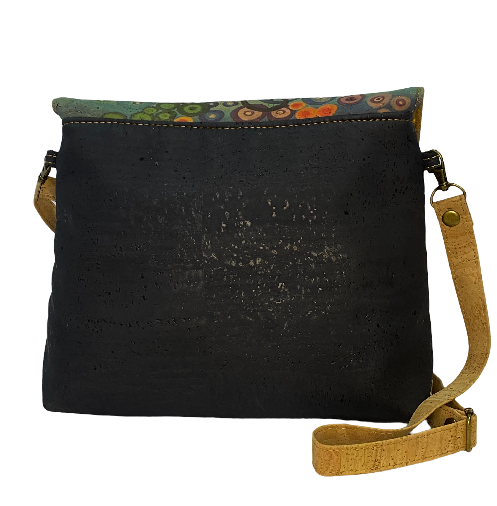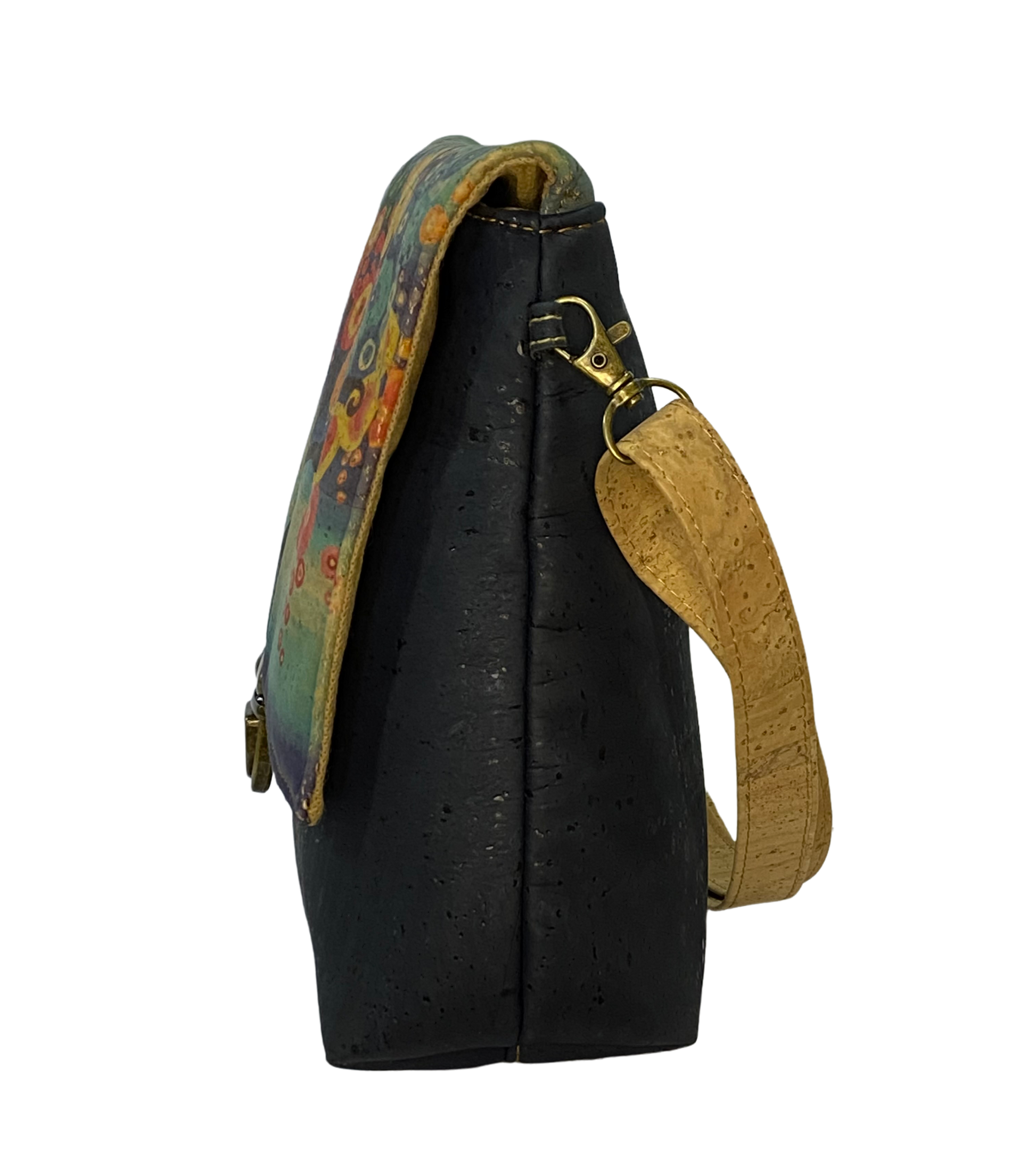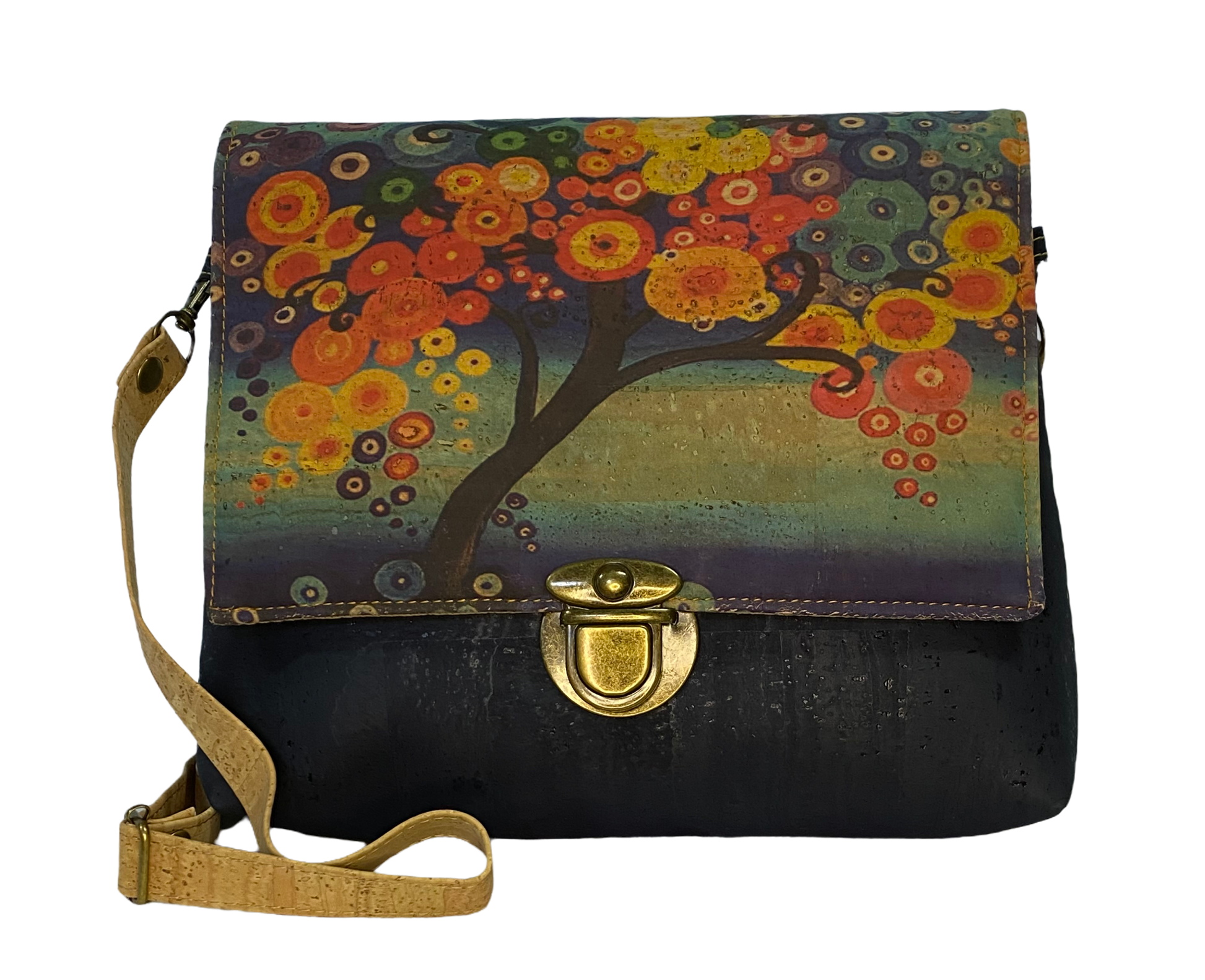 Cork bag, square shape with flap with padding, printed with an image of the tree of life and base in dark blue cork.