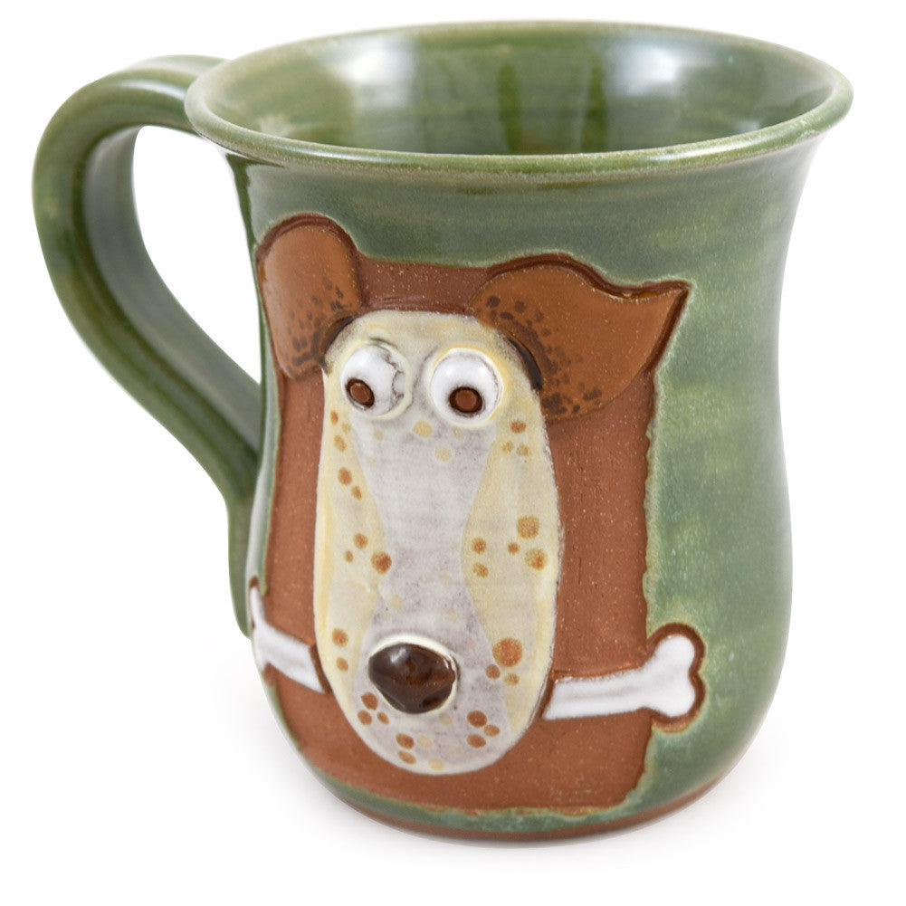 This mug features a dog with bone in mouth, wide eyes, glossy nose. Perfect for any dog-lover. All of our mugs are hand-thrown in stoneware clay and hand-painted. This piece was hand-dipped in our lead free Williamsburg Blue glaze. Due to the hand-made nature of the item, please understand that no two mugs will be exactly the same. Such is the beauty of handcrafted goods! Microwave, dishwasher and food safe. Hand-made with love and puppy kisses in Effort, PA, USA Materials: Ceramic