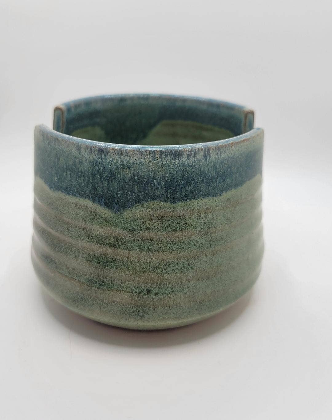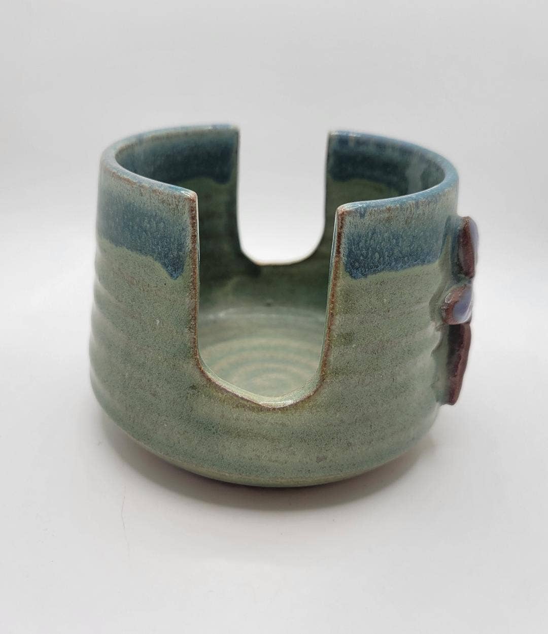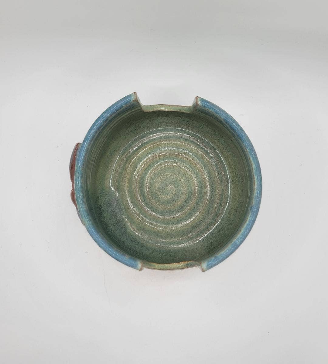 All of our sponge holders are hand-thrown in stoneware clay, hand-painted, and hand-dipped in our lead free Wrigley's Green and Williamsburg Blue glazes. Due to the hand-made nature of the item, please understand each may have slight variations in color, shape, and size.