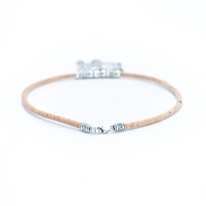 The necklace itself is made of cork cord, which is a sustainable material derived from the bark of cork oak trees. Cork cord is lightweight, durable, and environmentally friendly, making it an excellent choice for those who value eco-conscious fashion.