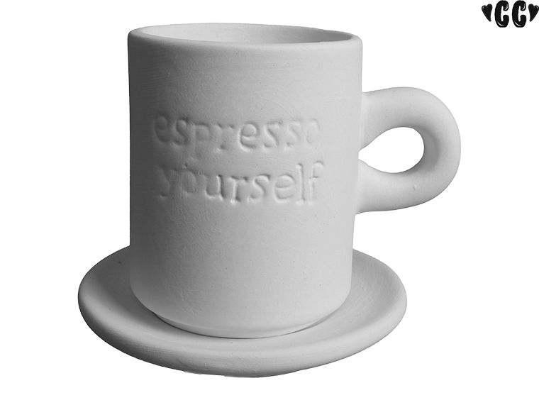 The Espresso Yourself Set is the perfect morning coffee set. It features a tiny saucer and a little espresso mug with a two-finger handle, and the words "Espresso Yourself" on one side.