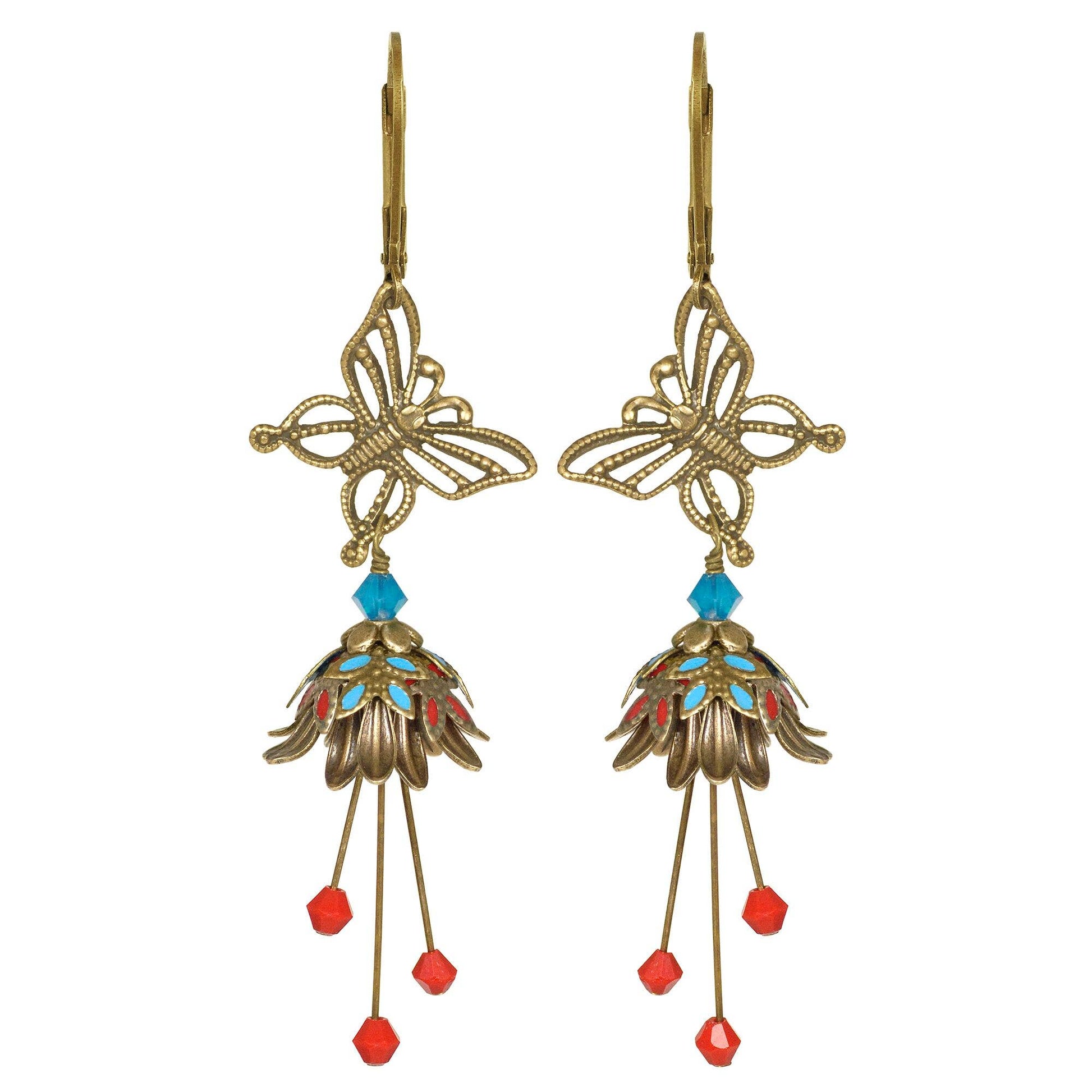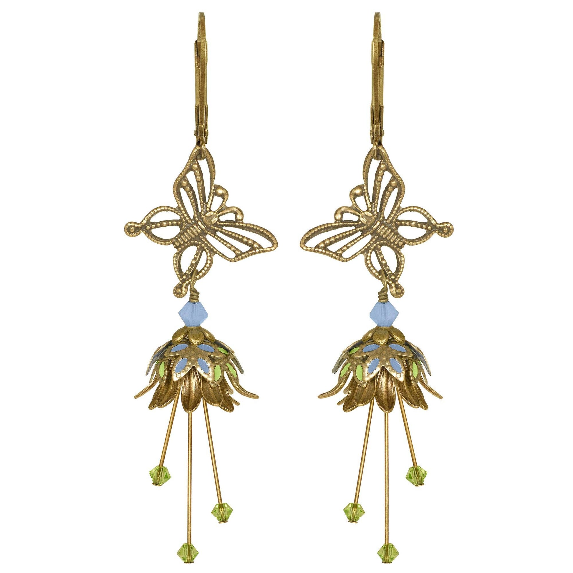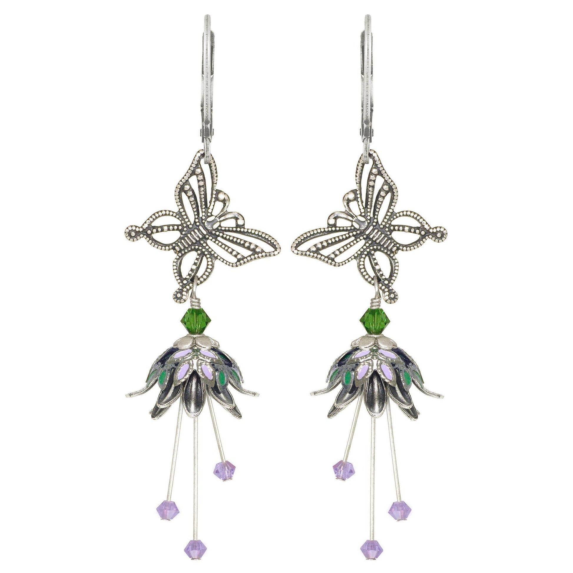 These drop earrings are available in antique brass or silver plated brass in three captivating color combinations: gold, periwinkle, and lime; gold, red, and blue; and silver, lilac, and green. Secure lever-back closures keeps them safely on. Approximately 2 inches long, they sway with every movement, catching the light and adding an elegant sparkle to your look. These earrings are made in the USA and come in a lovely flower-accented box, perfect for storage or a memorable gift. Embrace the beauty of Art Nouveau with the enchanting Butterfly Song.