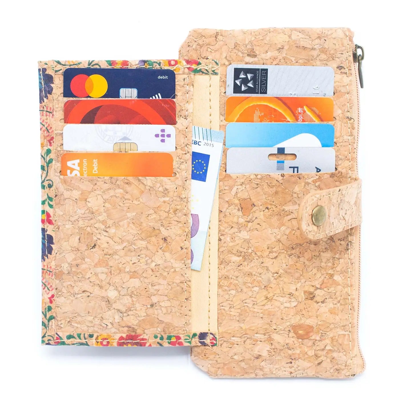 Slim and compact vegan cork wallet. It has 8 card slots, 1 bill pocket, and one zipper pocket for your coins. This mesmerizing cork wallet is the perfect choice for your vegan lifestyle, as it's made out of cork, a material extracted from oak trees in an organic and sustainable way. The fact that this cork item can easily fit into your handbag makes it so practical and easy to carry.
