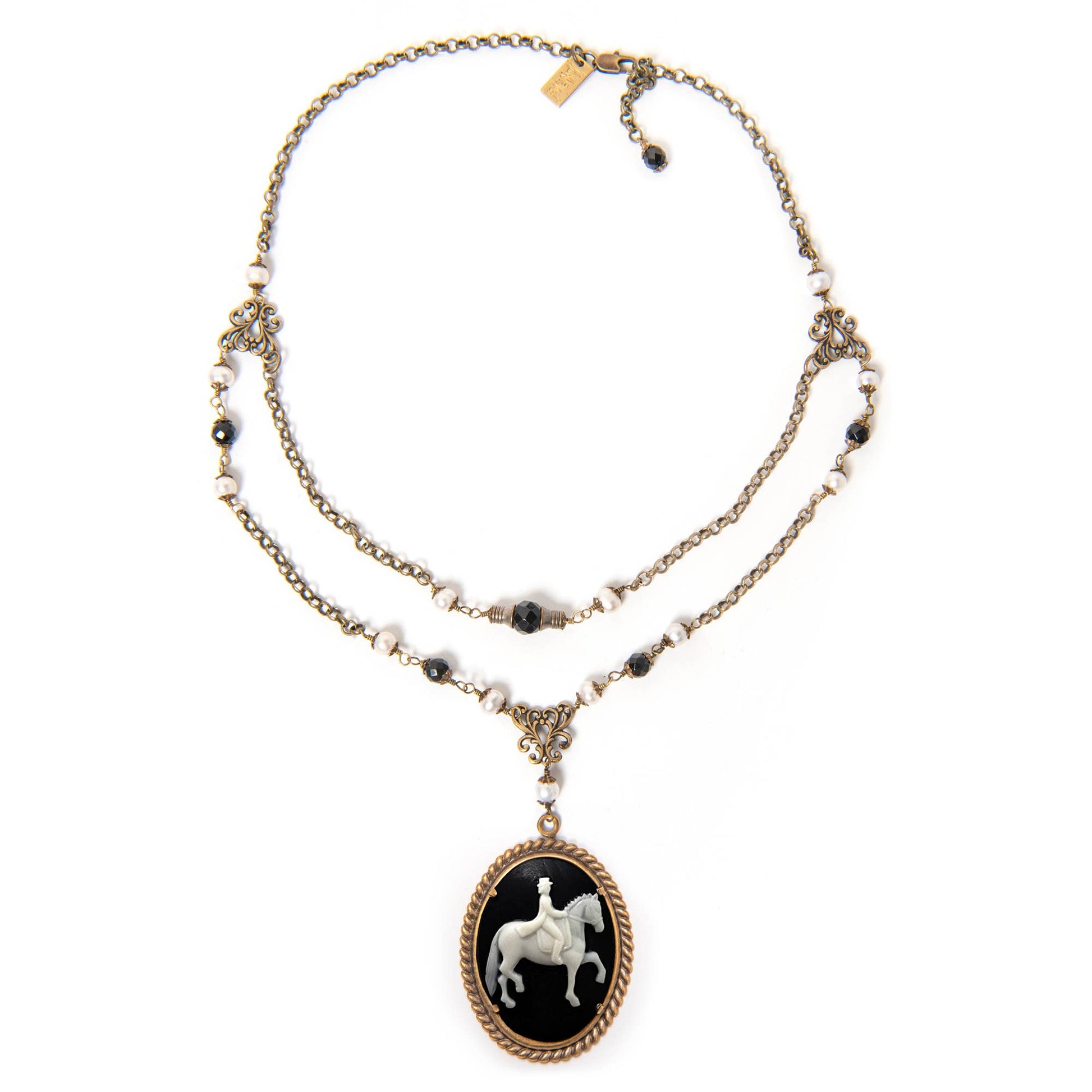 This is a double strand chain, faceted onyx and freshwater pearl necklace accented with heart-shaped connectors and a centerpiece of a beautiful dressage rider cameo in a rope frame. I've used two sizes of onyx beads for this necklace, using a larger in the center of the top strand.