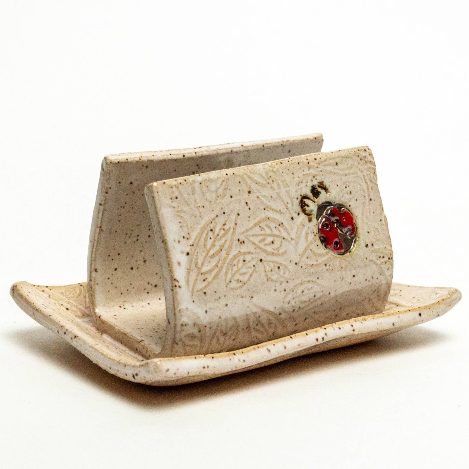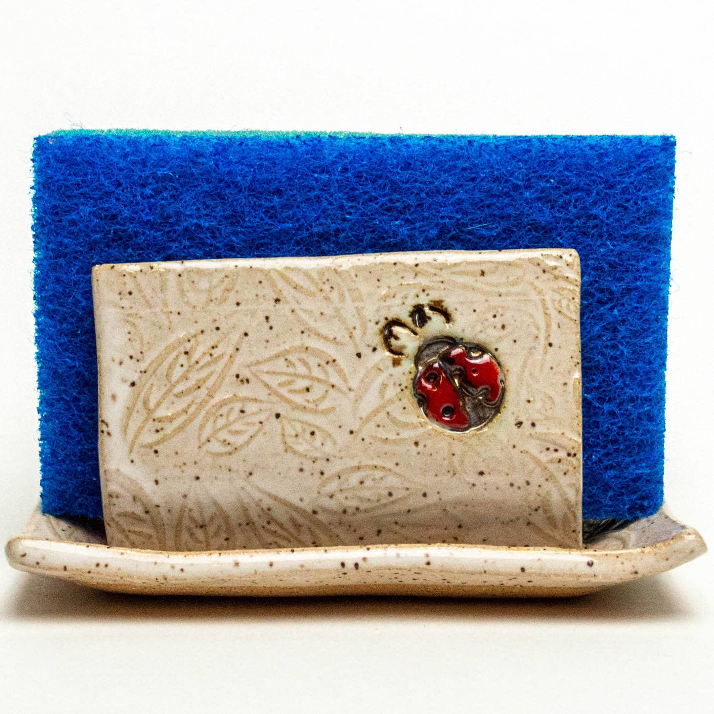 This beautiful ladybug pattern sponge holder is hand-built and hand-glazed in Oberlin, OH, USA. Food, dishwasher, and microwave safe. It measures approximately 4 inches long by 3 inches wide and 2.5 Inches high. All our ceramic items are handmade and will vary from one to the next. No 2 pieces will be exactly the same. Colors and glaze patterns may vary slightly.
