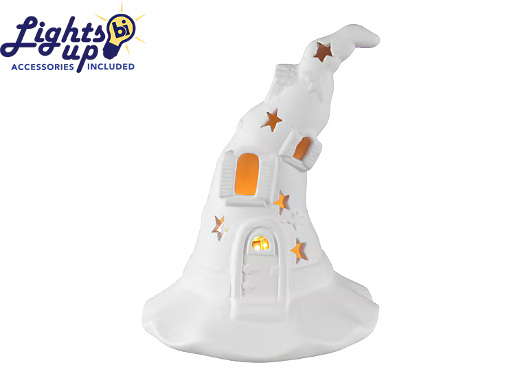 Legend says a magical witch resides here...enter at your own risk! The Lighted Zane's Haunted Hideaway is named for its spooky aura, and makes the most chilling light for Halloween nights. But don't be fooled in thinking this piece is only meant for the Halloween season! This bisque shape can also be painted as a witch or wizard hat all year long. This ceramic hat includes a light kit and bulb to help show off its magical glow through star-shaped cut outs and open shutter windows. Eerily perfect!