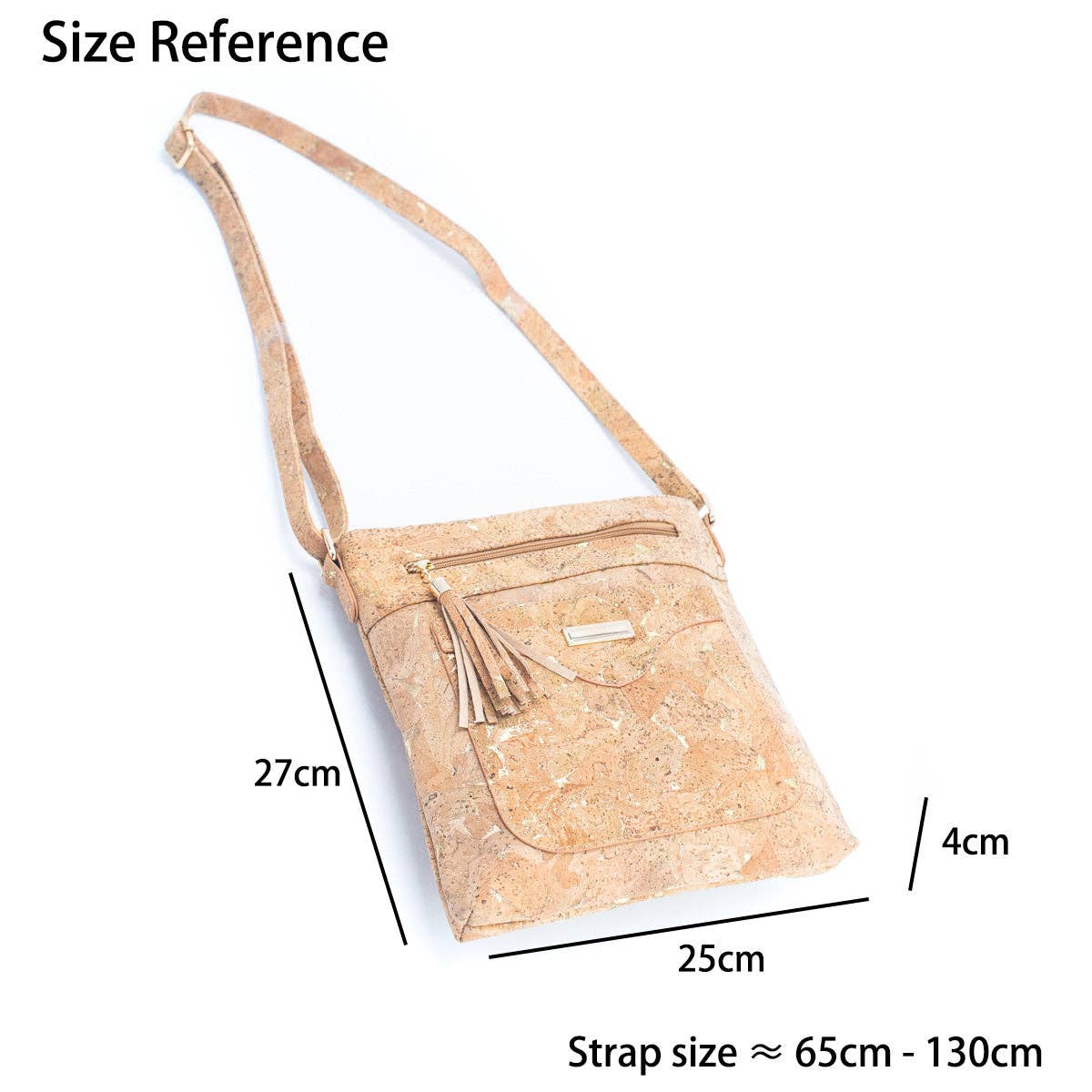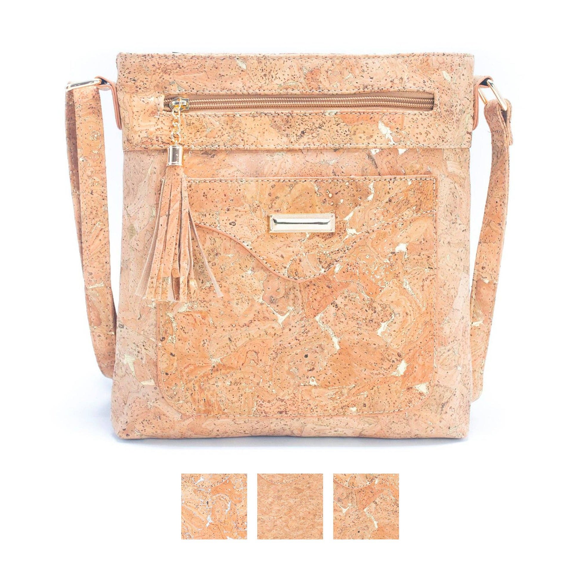 Stylish crossbody bag for women, made with exceptionally soft natural cork material and available in three different styles. The bag features a gold or silver-tone hardware paired with natural cork or an original cork design, adding a touch of elegance to any outfit. With a pocket on both the front and back of the bag, it offers ample storage space for your essentials.