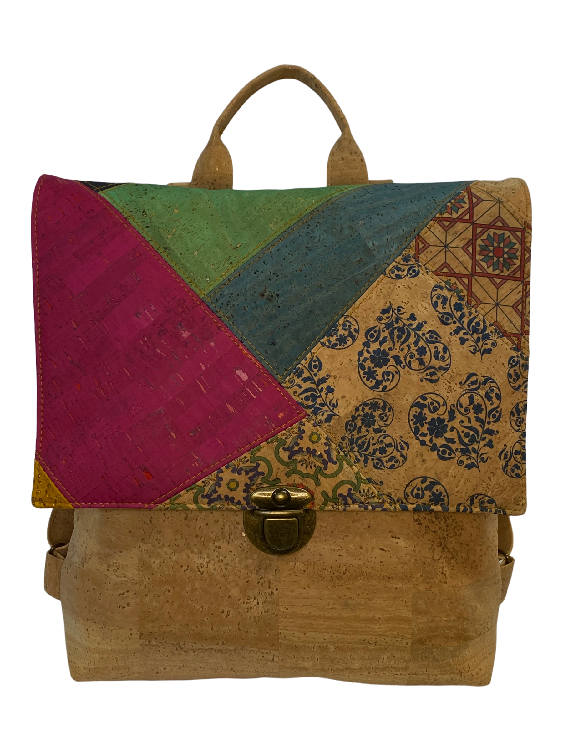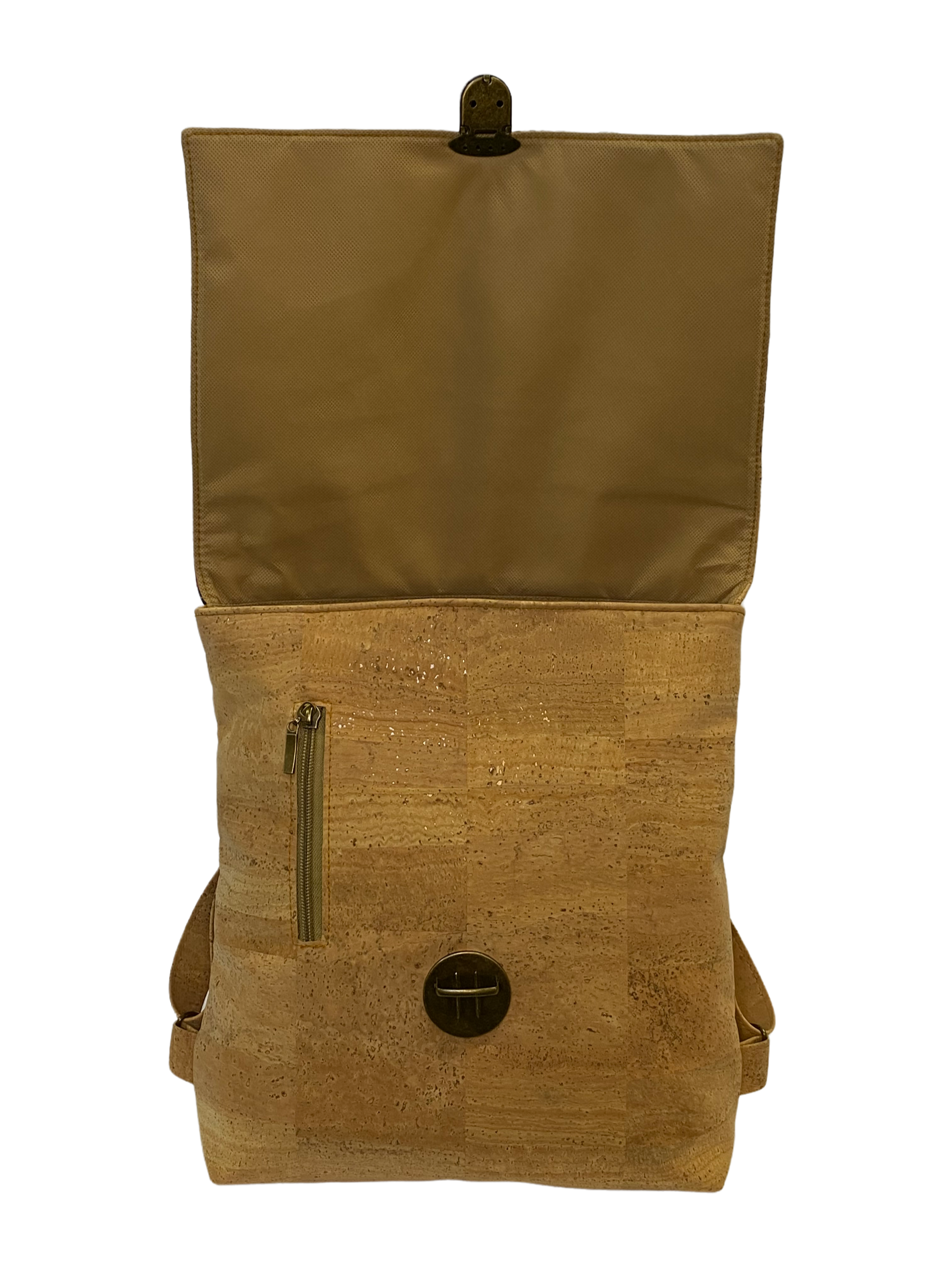 Backpack in cork large size, with flap with padding, natural color and base also in natural.
