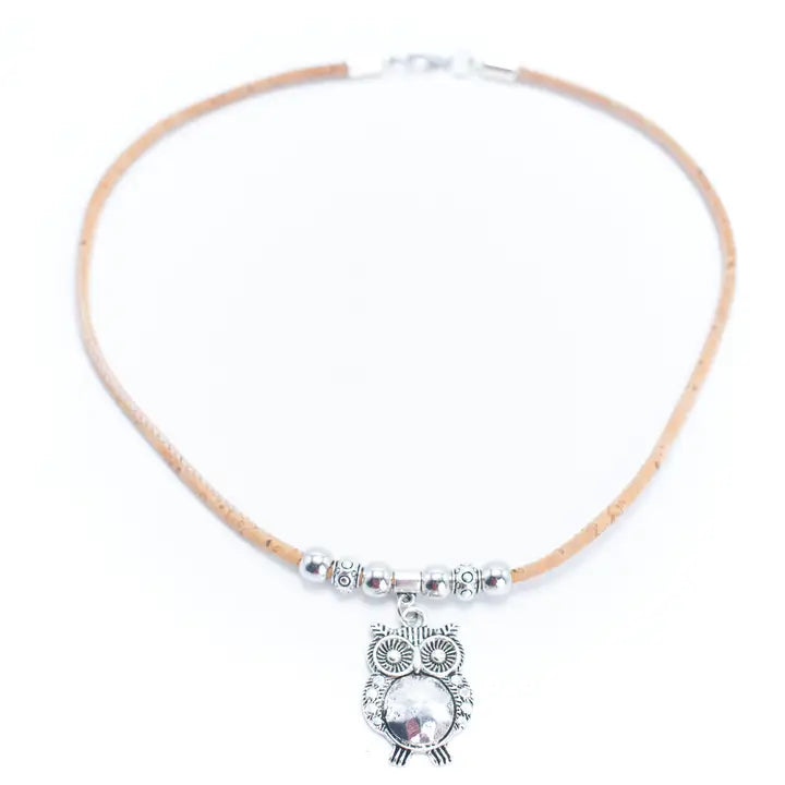 The owl pendant is typically crafted from zamak metal. The cork cord necklace provides a natural and eco-friendly alternative to traditional metal or synthetic chains.