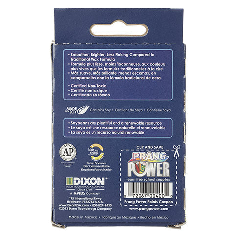 Color freely with this 24-piece pack of Prang® soy crayons that flake less than traditional crayons for improved durability. Their unique soybean oil formulation lets you sketch with environmental awareness, and each crayon has 0.25" wide by 3.5" high sizing for an easy grip. Certified AP nontoxic.