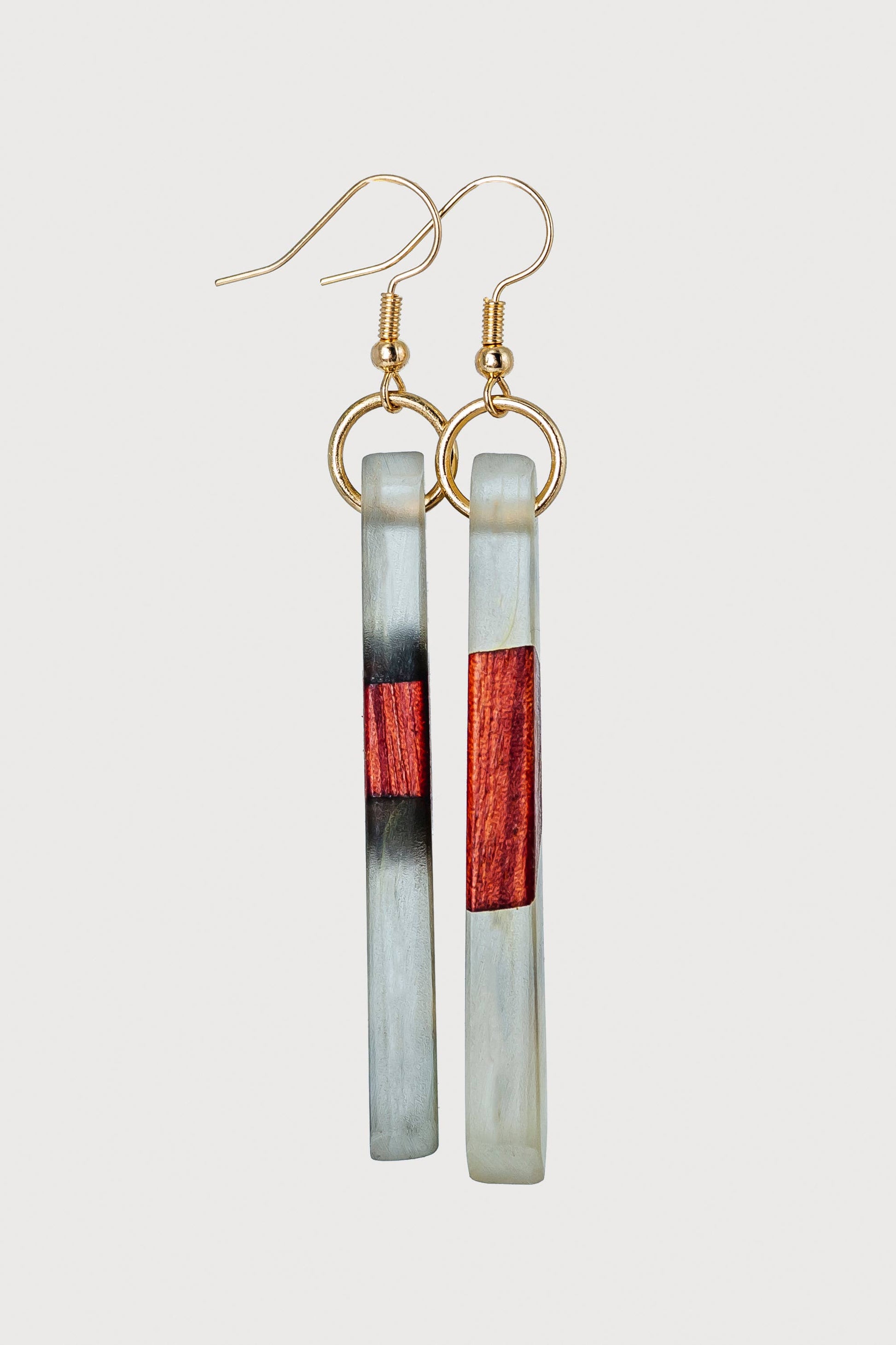 our eye catching earrings combine eco-friendly, up-cycled cuts of wood with bright, warm, resin colors.
