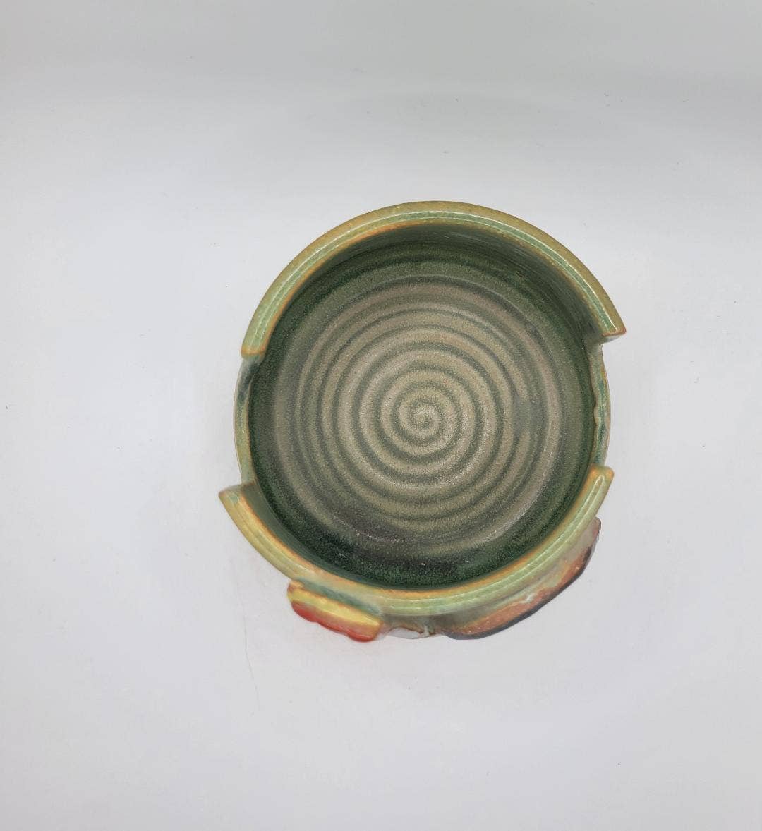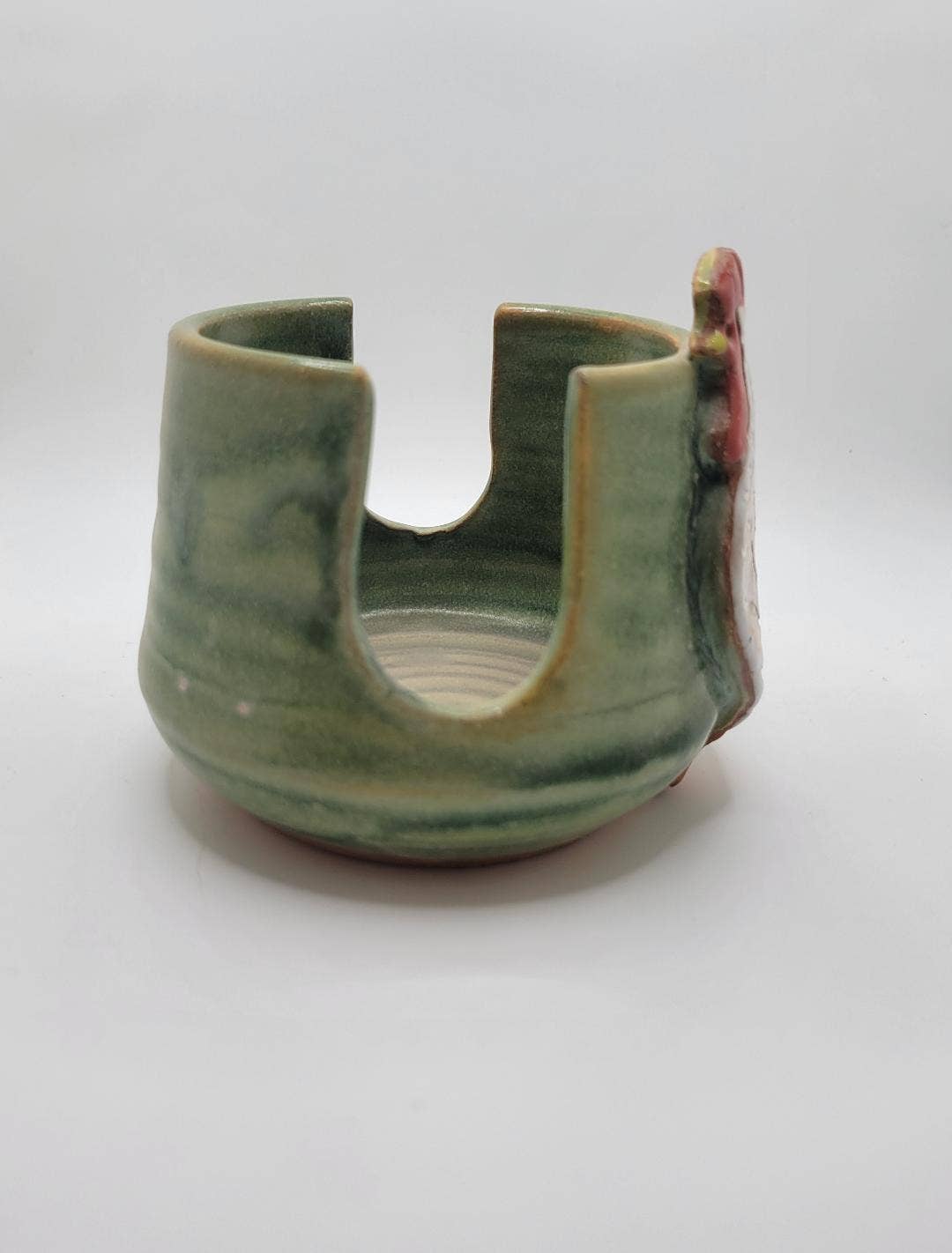 All of our sponge holders are hand-thrown in stoneware clay and hand-painted. This piece was hand-dipped in our lead free Wrigley's Green glaze. Accounting for the hand-made nature of the item, please recognize each may have slight variations in color, shape, and size. That is the uniqueness of handcrafted goods! Our sponge holders typically measure about 2.5 inches tall by 3.5 inches at the widest point.