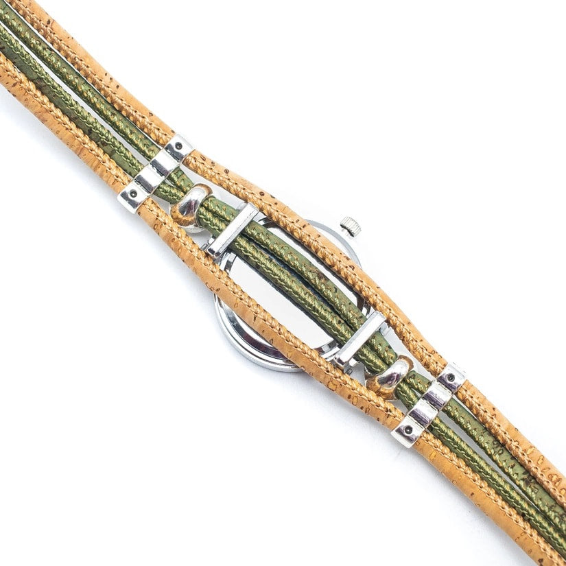 Natural and green cork cord  bracelet watch with classic silver dial.