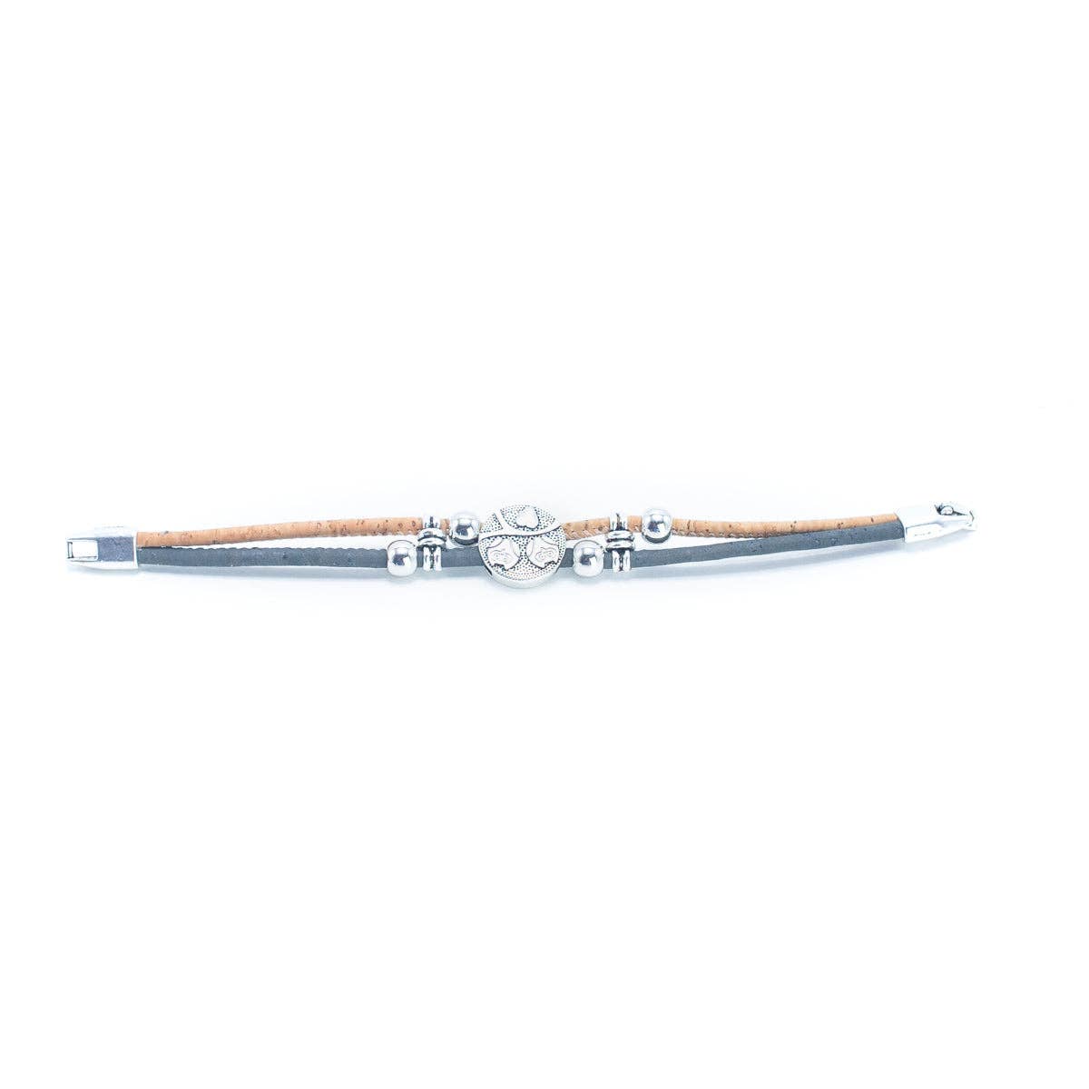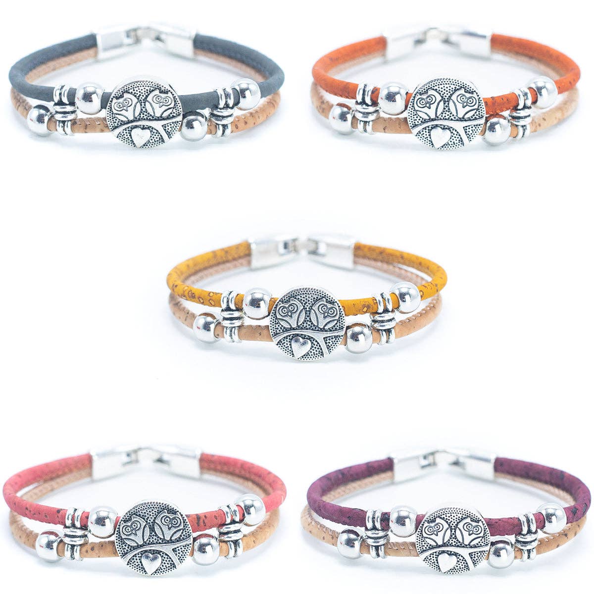 The bracelet is typically made from two strands of cork cord, each in a different color, woven together to create a layered or braided effect. The cork cord provides a natural and eco-friendly base for the bracelet.