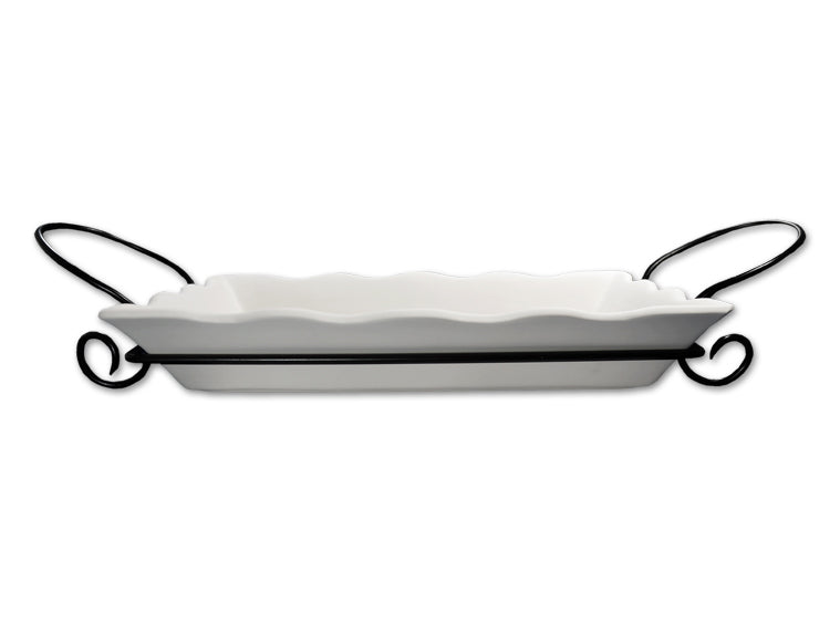 The Ruffle Casserole Dish is a very unique piece complete with an iron stand. The serving dish has lovely ruffled edges that add a touch of elegance to any tablescape. Serve your favorite meal in this great casserole dish.
