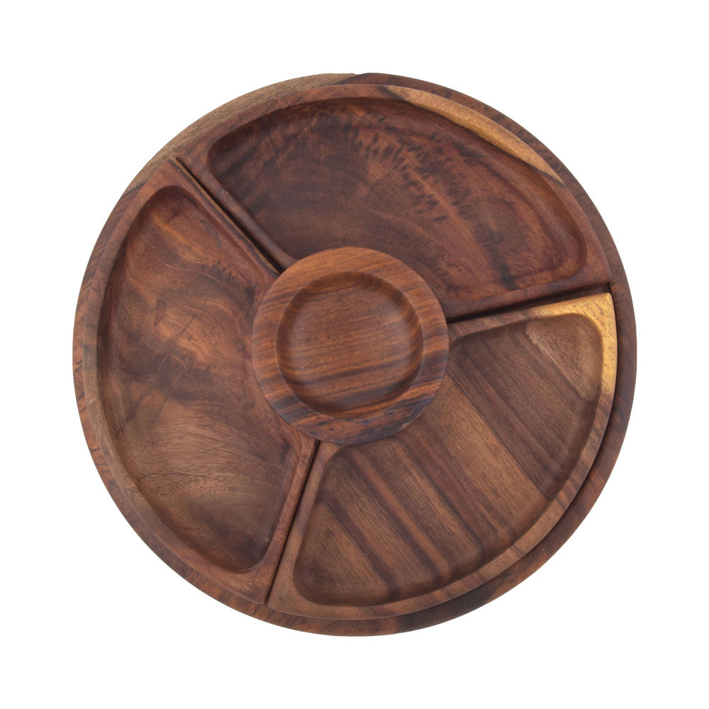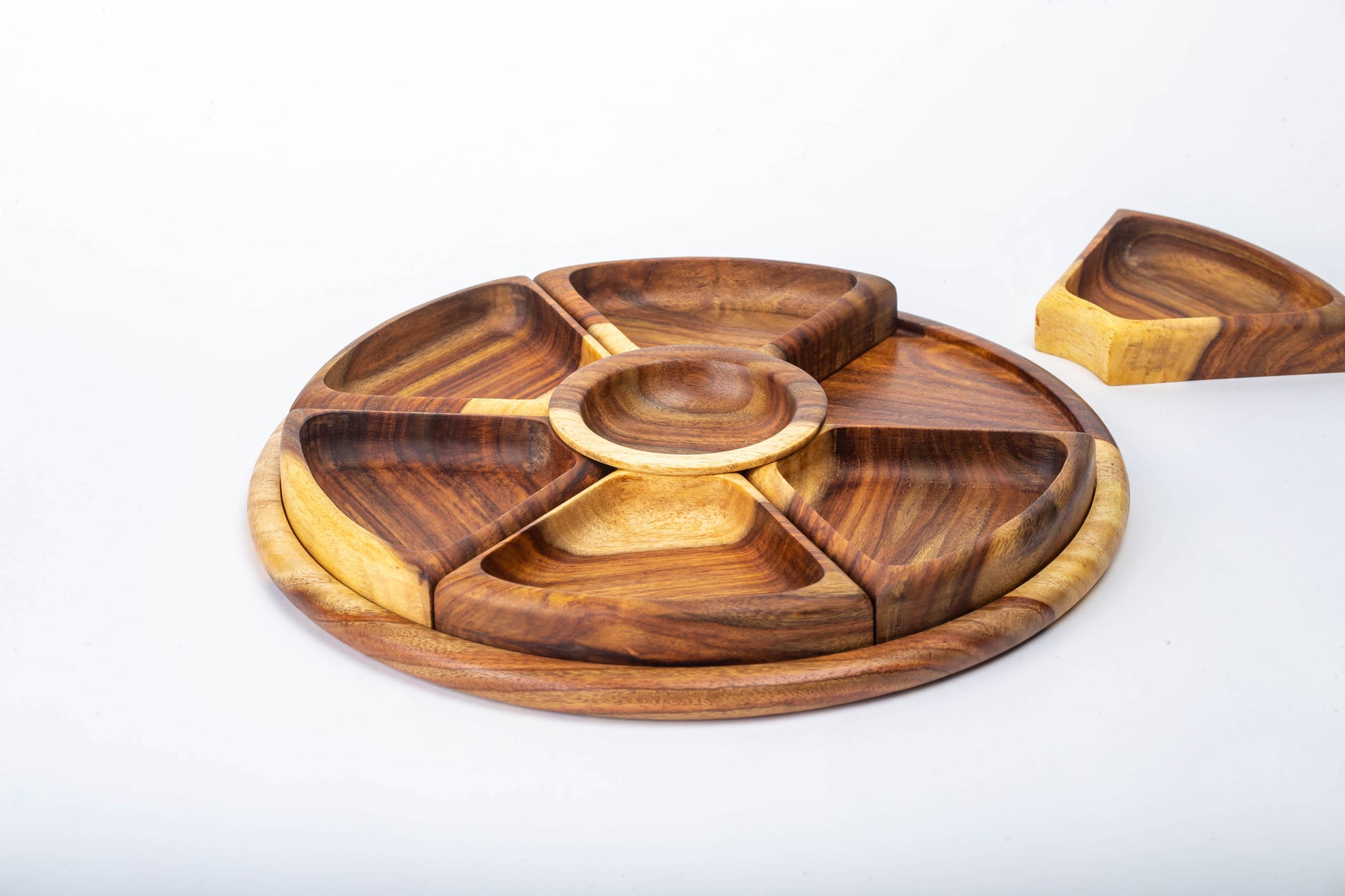 Complete your dinner table with creative beautiful hand crafted platter tray and removable sections made from rose wood. This snack tray sets are made of the highest quality wood Great for sharing nuts, treats and more. Due to the nature of the natural wood, pieces may have variations.