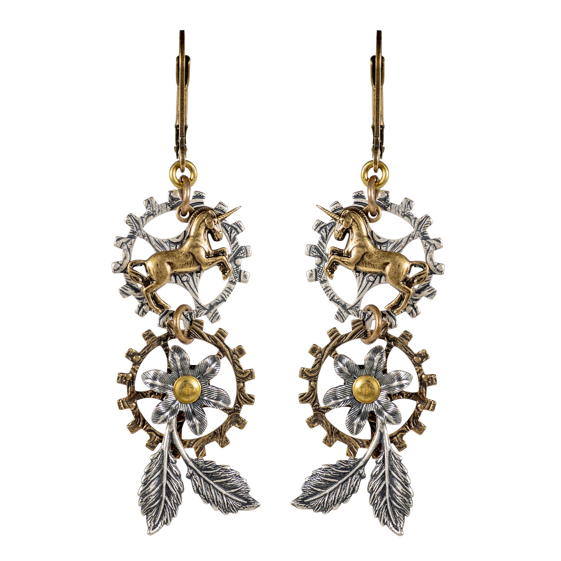 The "Steampunk Unicorn" earrings by NoMonet feature golden unicorns that dangle in front of silver etched gears. They have copper-plated etched gears that feature silver flowers with a golden center and leaves that dangle beneath the flowers. These earrings measure approximately two inches from their matching lever-backs. They are accented in various finishes: silver-plated, antiqued brass, and darkened brass. These earrings are versatile and can be worn on a variety of occasions, from casual to elegant. They are a perfect addition to any outfit and are sure to spark conversation wherever you go. Place your order for a set of these exceptional unicorn steampunk earrings today and let their enchanting and mysterious style influence your fashion sense. Featuring intricate details and top-notch craftsmanship, these earrings are bound to become a cherished addition to your jewelry collection, one that will be treasured for many years to come.
