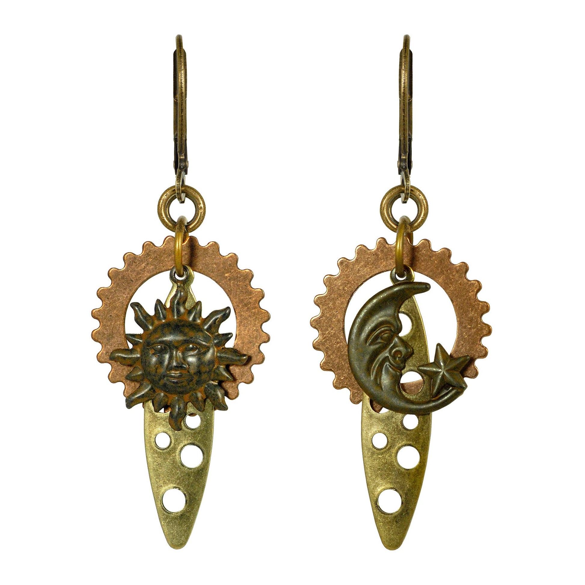 Sun, Moon, and Gears Asymmetrical Space Steampunk Earrings