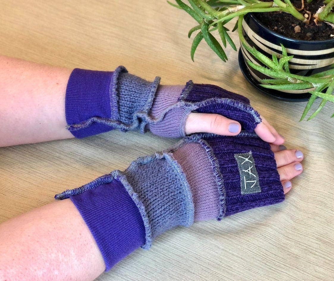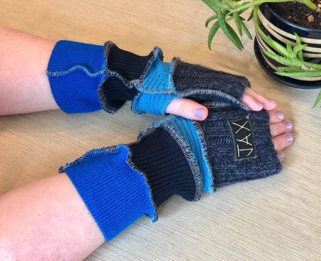 These handmade upcycled JAX texting gloves keep your hands cozy but fingers free! Using recycled sweaters these small batch fingerless gloves are unique and highly desired by our fans. Anymore you want your fingers free to access your phone instead of constantly taking your glove off. That is why we named them Texting Gloves. The seams are on the outside creating a deconstructed look. The label is on the right hand so you know which one is which! One size usually fits all.