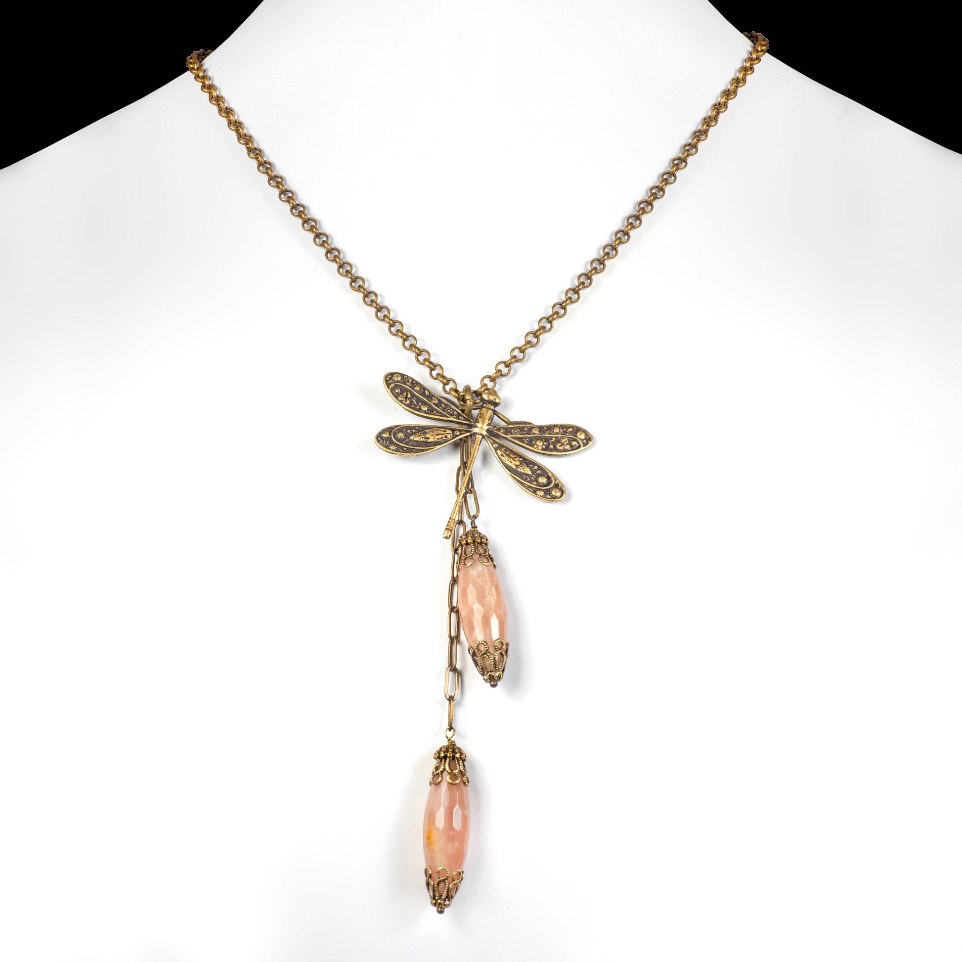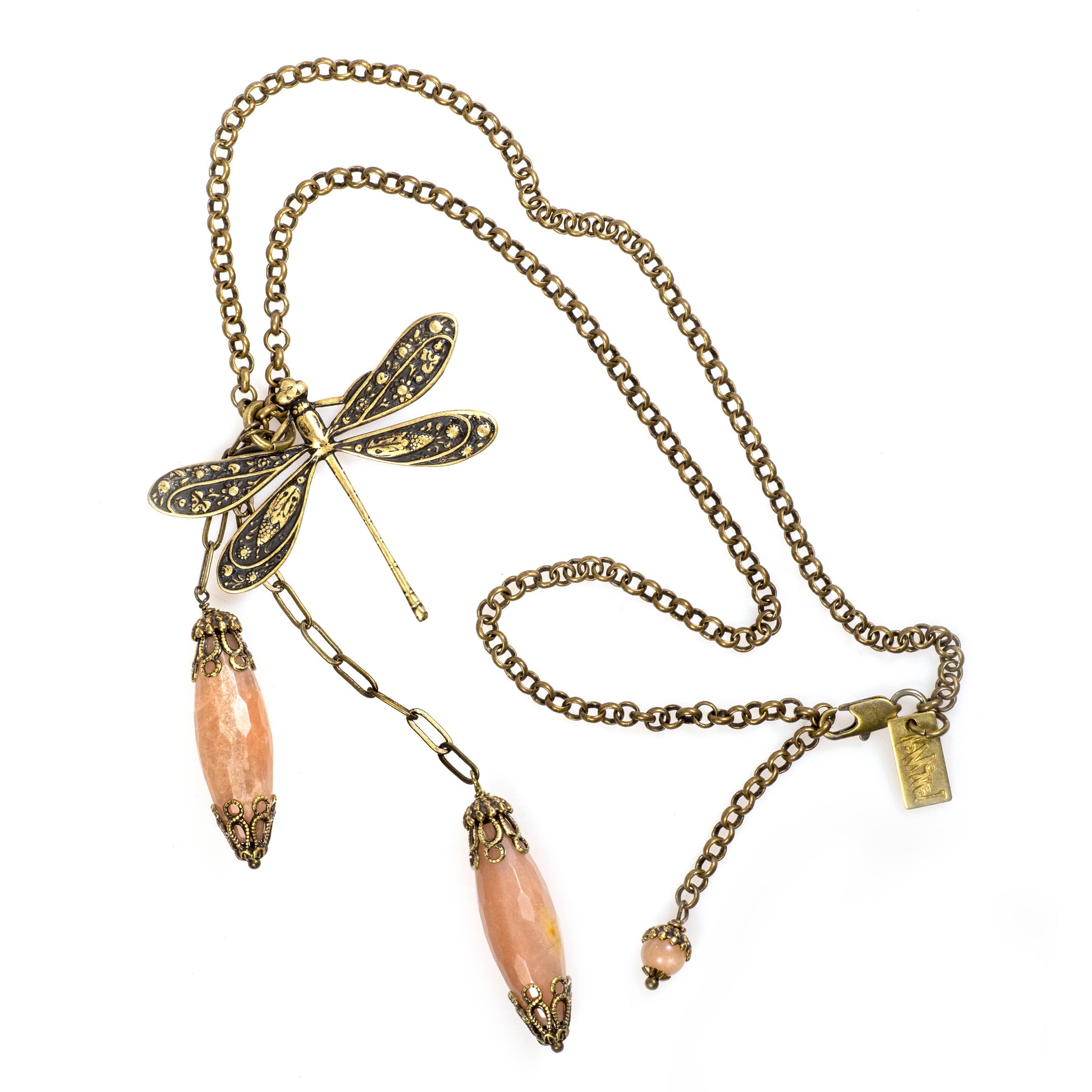 A vintage brass dragonfly along with a brass chain decorated with two faceted peach moonstone drops encased in vintage filigree create the centerpiece of this necklace. It is quite a statement piece. The dragonfly pendant hangs 4-1/2 inches from a 19 inch brass necklace with lobster claw clasp.