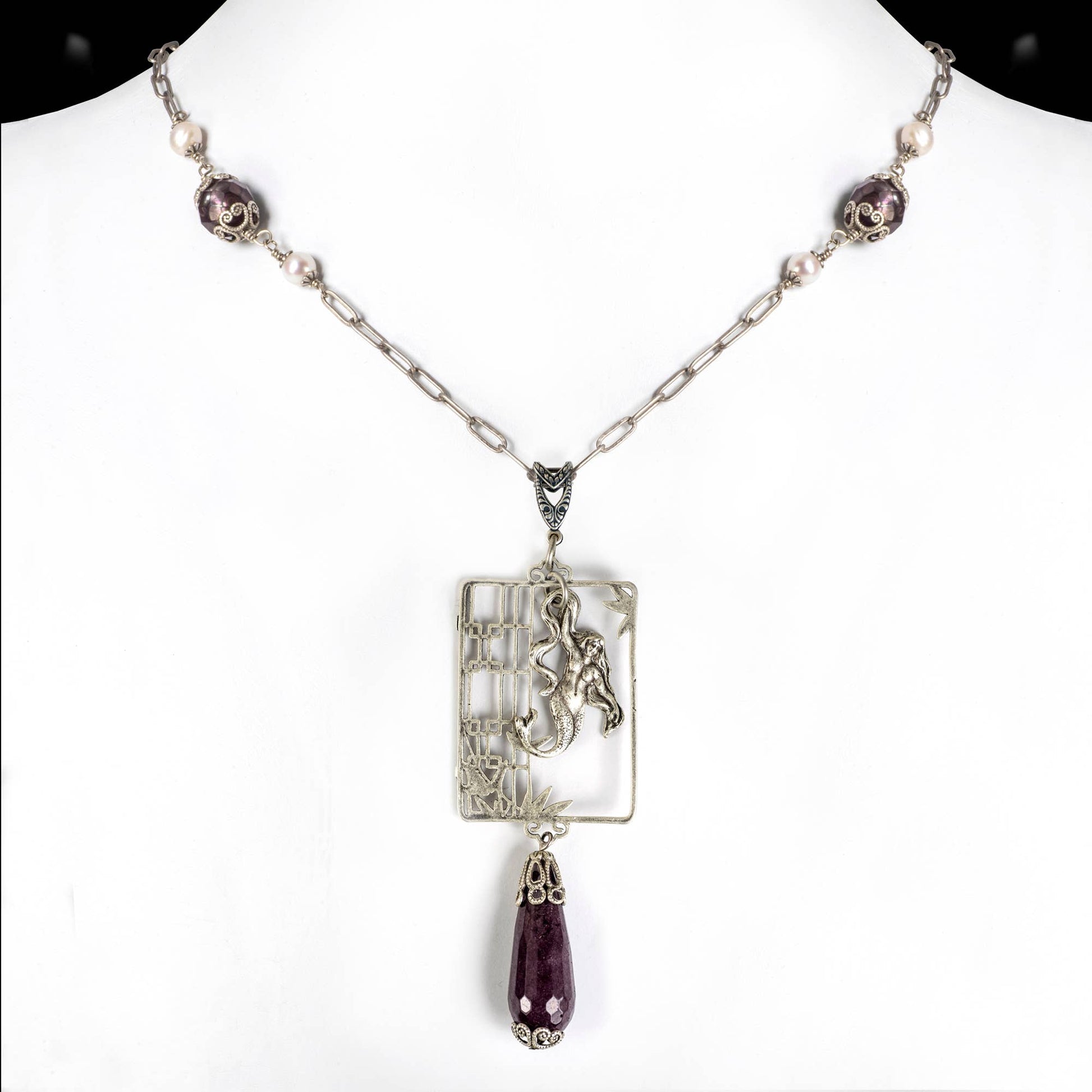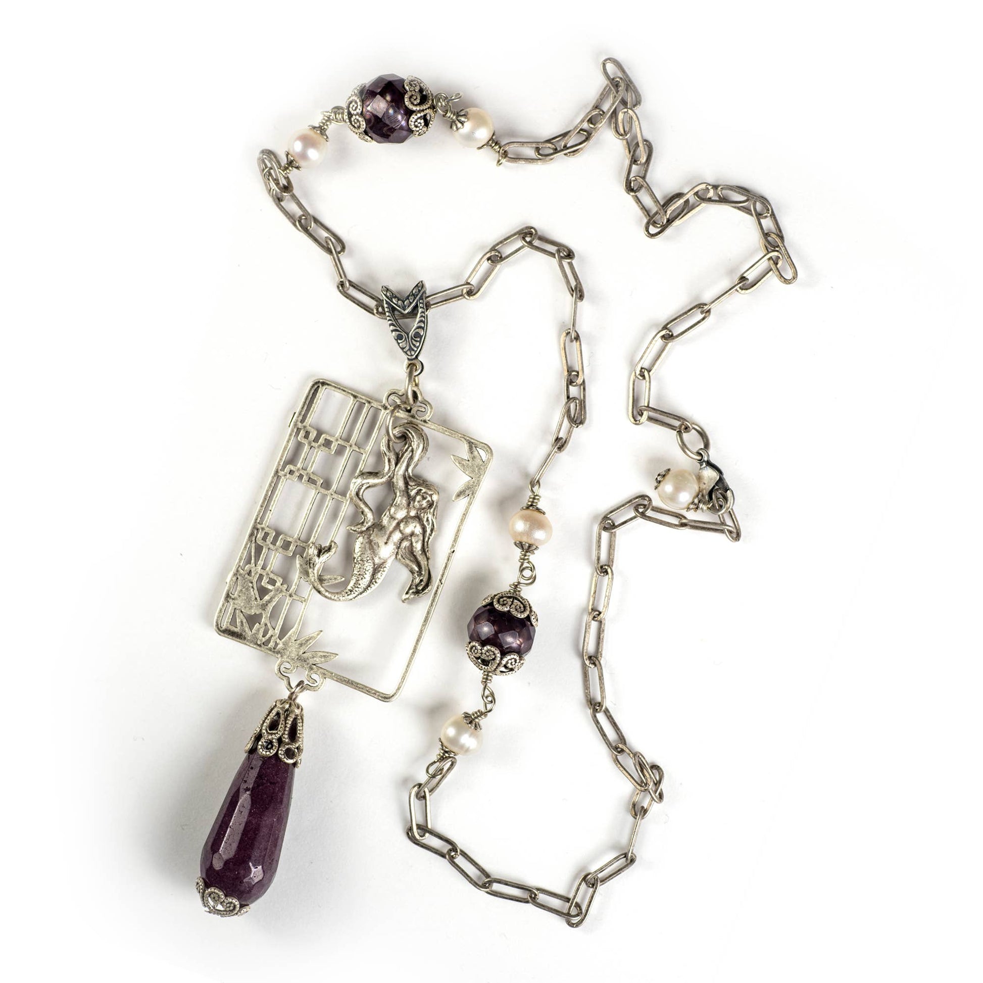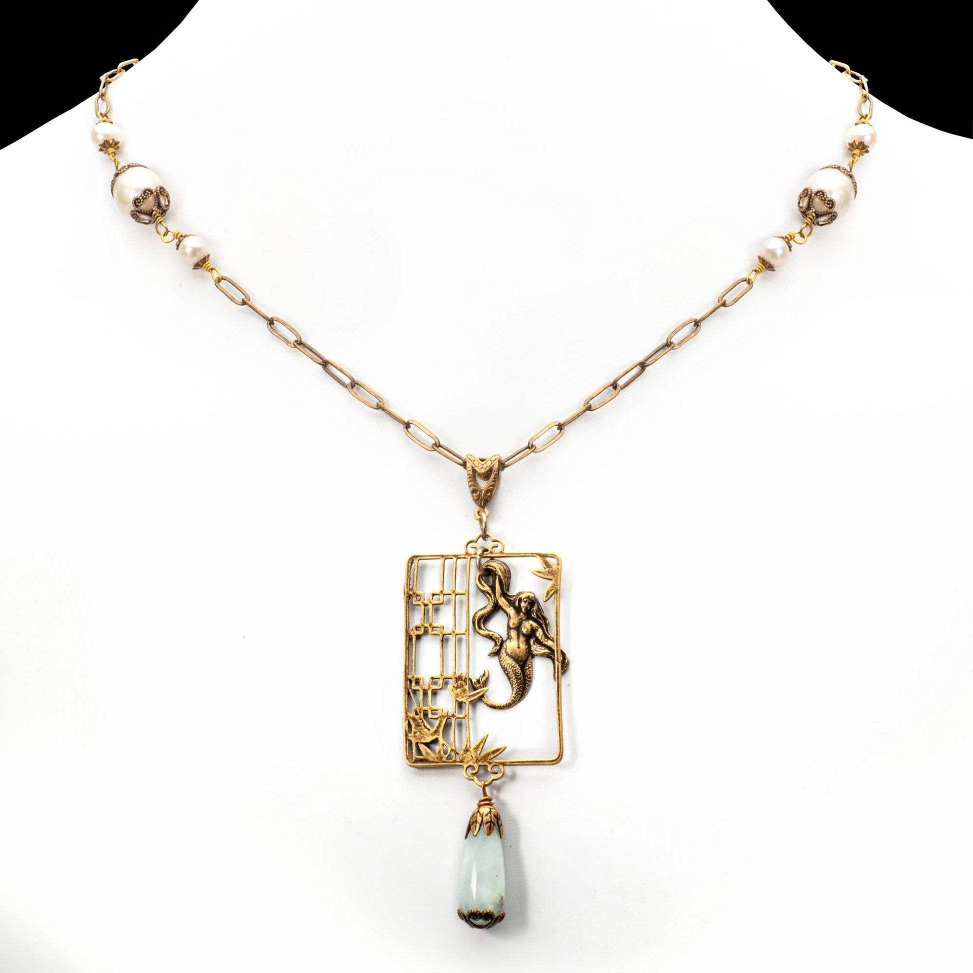 The "Mermaid Grotto" necklace by NoMonet spotlights lovely antiqued brass stampings of a square window framed by bamboo, and a geometric patterned area provides the setting for a beautiful mermaid hanging from the top of the pendant. Hanging gracefully beneath it is a 20mm Chalcedony drop. From the top of the grotto to the bottom of the drop, the pendant and drop measure 2-3/4" or 70mm. The chain of this necklace is decorated with cream-colored freshwater pearls, framed by vintage-designed bead caps. The chain is 18" in length and adjustable with a fishhook-style clasp. This necklace comes in two finishes: antiqued brass and silver-plated brass, and the Chalcedony drop comes in two colors: blue and purple. Add this unique and charming piece to any outfit with its classy and versatile design that is suitable for any occasion. Grab yours now and enjoy the lovely style of this captivating necklace.