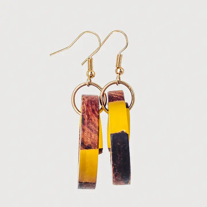 our eye catching earrings combine eco-friendly, up-cycled cuts of wood with bright, warm, resin colors.