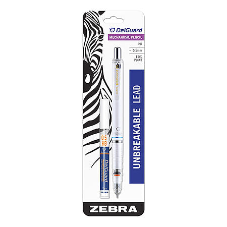DelGuard's double spring, patent-pending mechanism ensures lead is secure and protected from breakage without scratching. Pencils feature a light-weight, black, blue or white barrel with a textured grip. Each pack contain one .5mm fine point DelGuard Mechanical Pencil and a 12-piece HB lead refill.